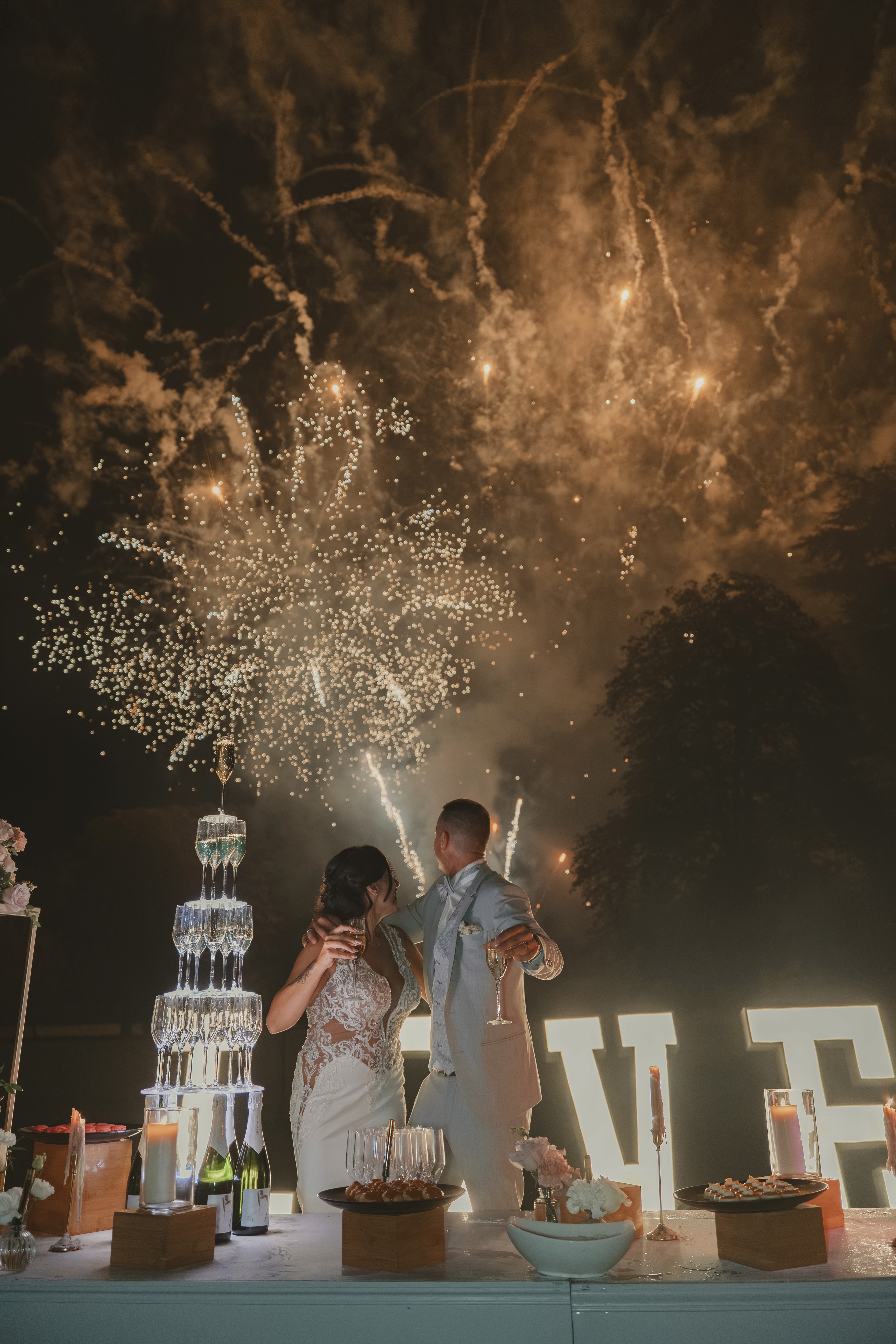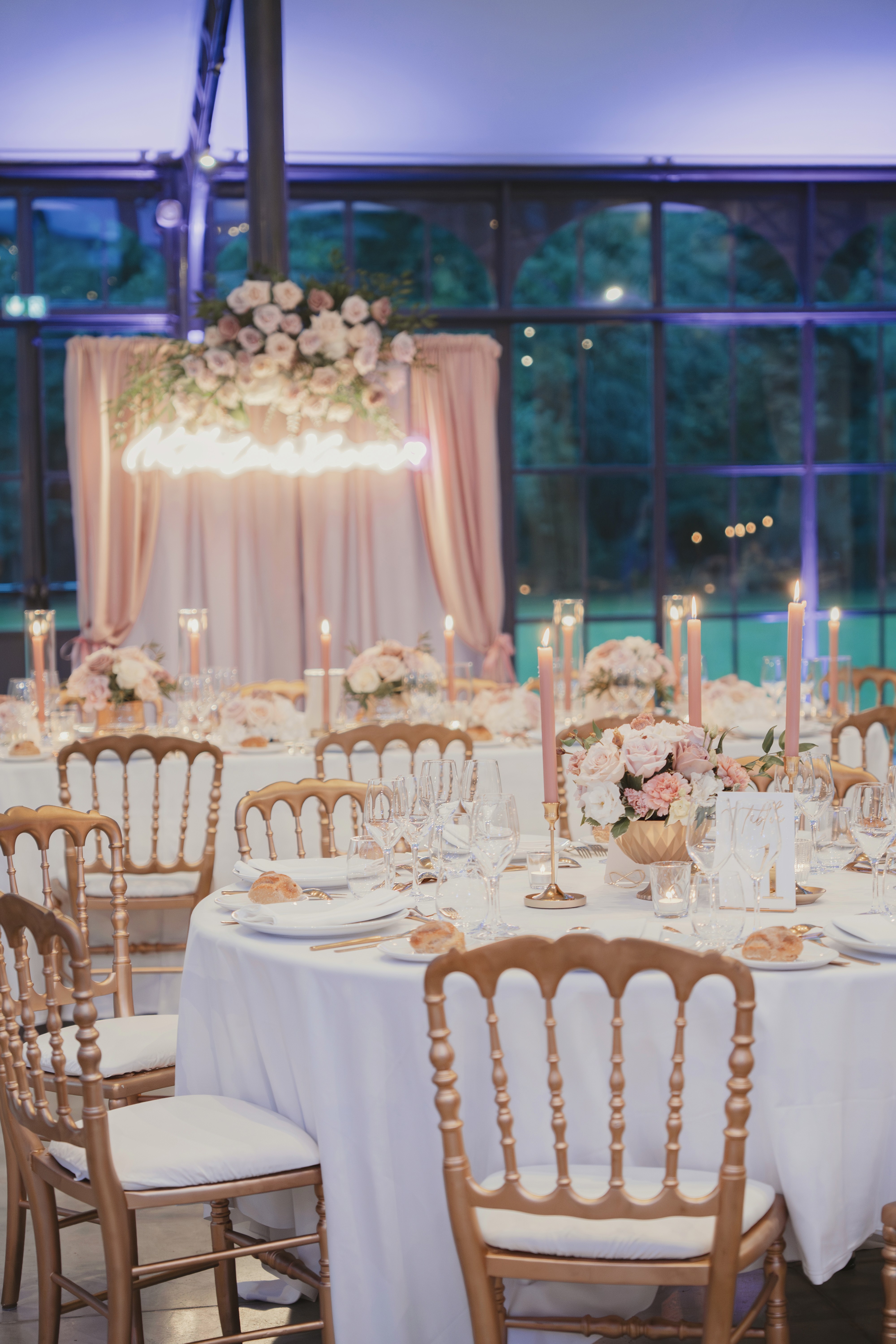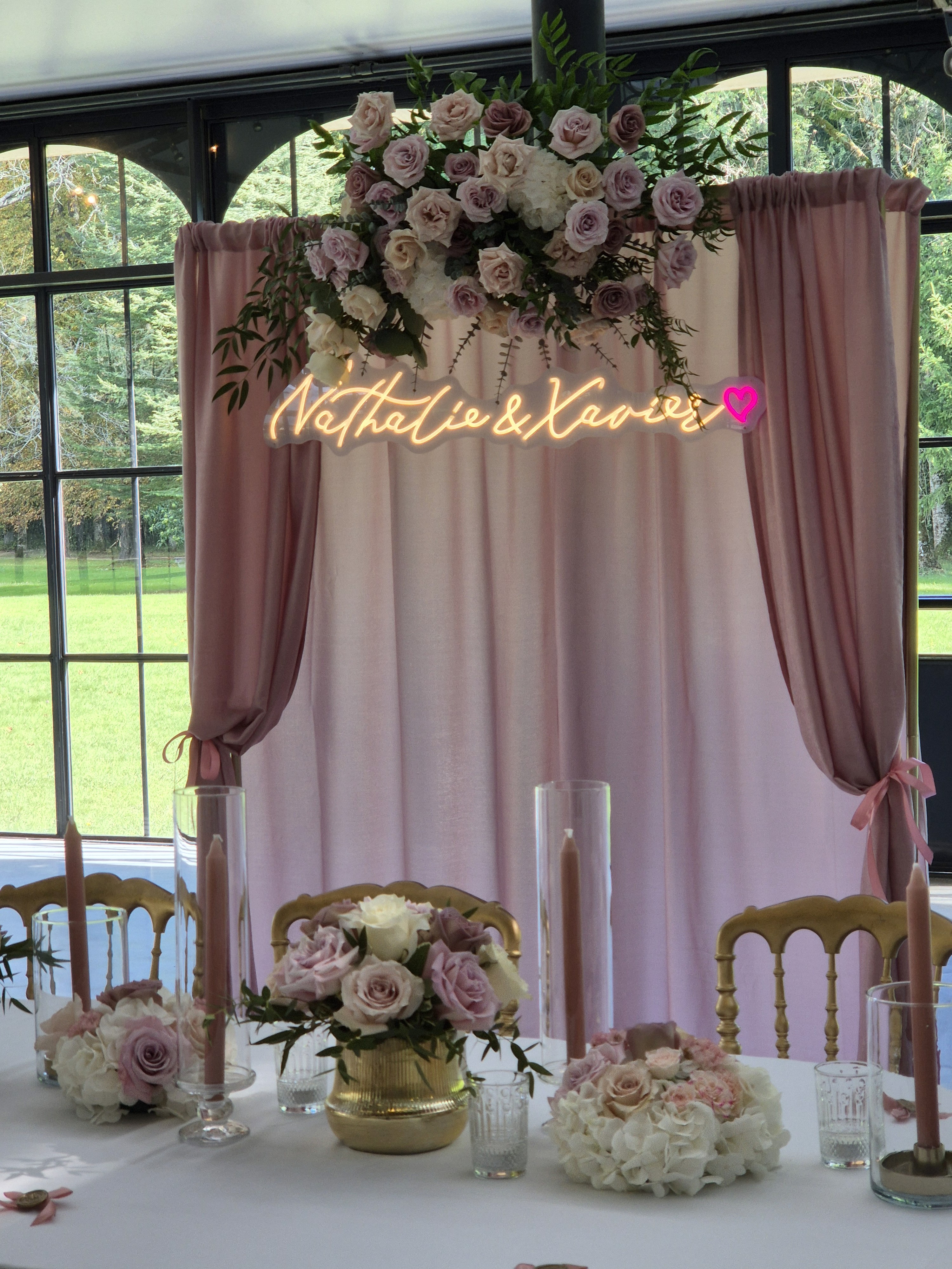 L'arche avec le néon personnalisé en back drop, véritable point focal, enveloppe les mariés dans un écrin et sublime la table d'honneur.